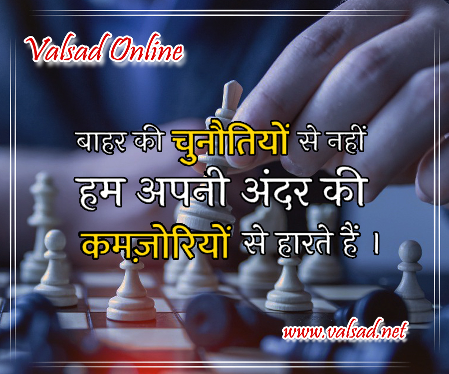 Thoughts बाहर की चुनाैतियाें से नहीं हम अपनी अंदर की कम़जोरियों से हारते हैं । ValsadOnline October 13, 2022 0 बाहर की चुनाैतियाें से नहीं हम अपनी अंदर की कम़जोरियों से हारते हैं । ” We lose from our inner weaknesses, not from outside challenges.”
